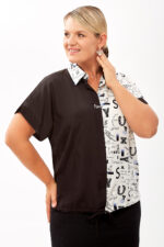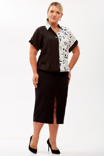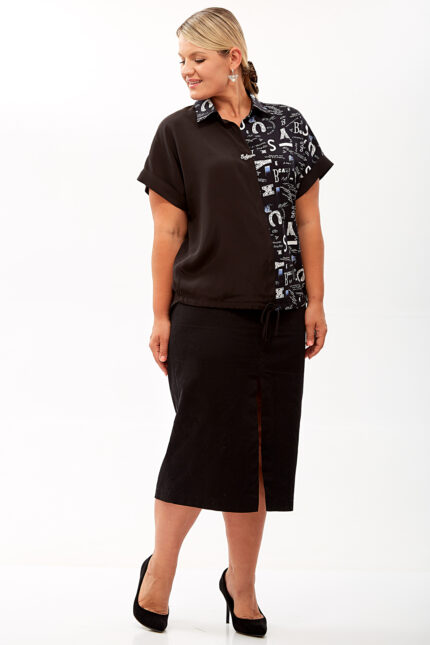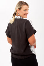 Эта стильная блузка свободного силуэта сочетает в себе элементы классического и спортивного стилей, что делает её универсальной для различных поводов.