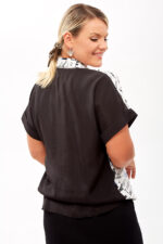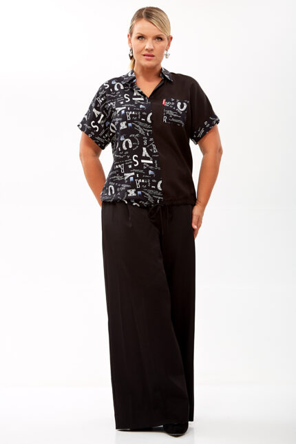 Эта блузка свободного силуэта сочетает в себе элементы классического и спортивного стилей, что делает её универсальной для различных поводов.
